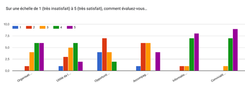 Les raisons de satisfaction viennent plutôt de la clarté et de la régularité de l’information et de la communication (15 réponses), de la convivialité et de l’esprit de réseau (16 réponses) et de l’organisation interne (12 réponses). Les pointes d’insatisfaction viennent essentiellement du manque d’opportunités professionnelles actuellement offertes par l’Association (8 réponses) et de l’absence actuelle d’accompagnement des adhérents (7 réponses). Il s’agit d’ailleurs de 2 points dont l’équipe coordonatrice est bien consciente et sur lequel des réponses devraient bientôt être trouvées grâce à notre nouvelle plateforme Agora.